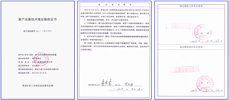2013年5月,由黑龍江省工信委科技處組織,對USP-M系列超聲波除垢裝置進(jìn)行了新產(chǎn)品鑒定,鑒定結(jié)論:“屬國內(nèi)外首創(chuàng),其技術(shù)水平達(dá)到國內(nèi)領(lǐng)先”。